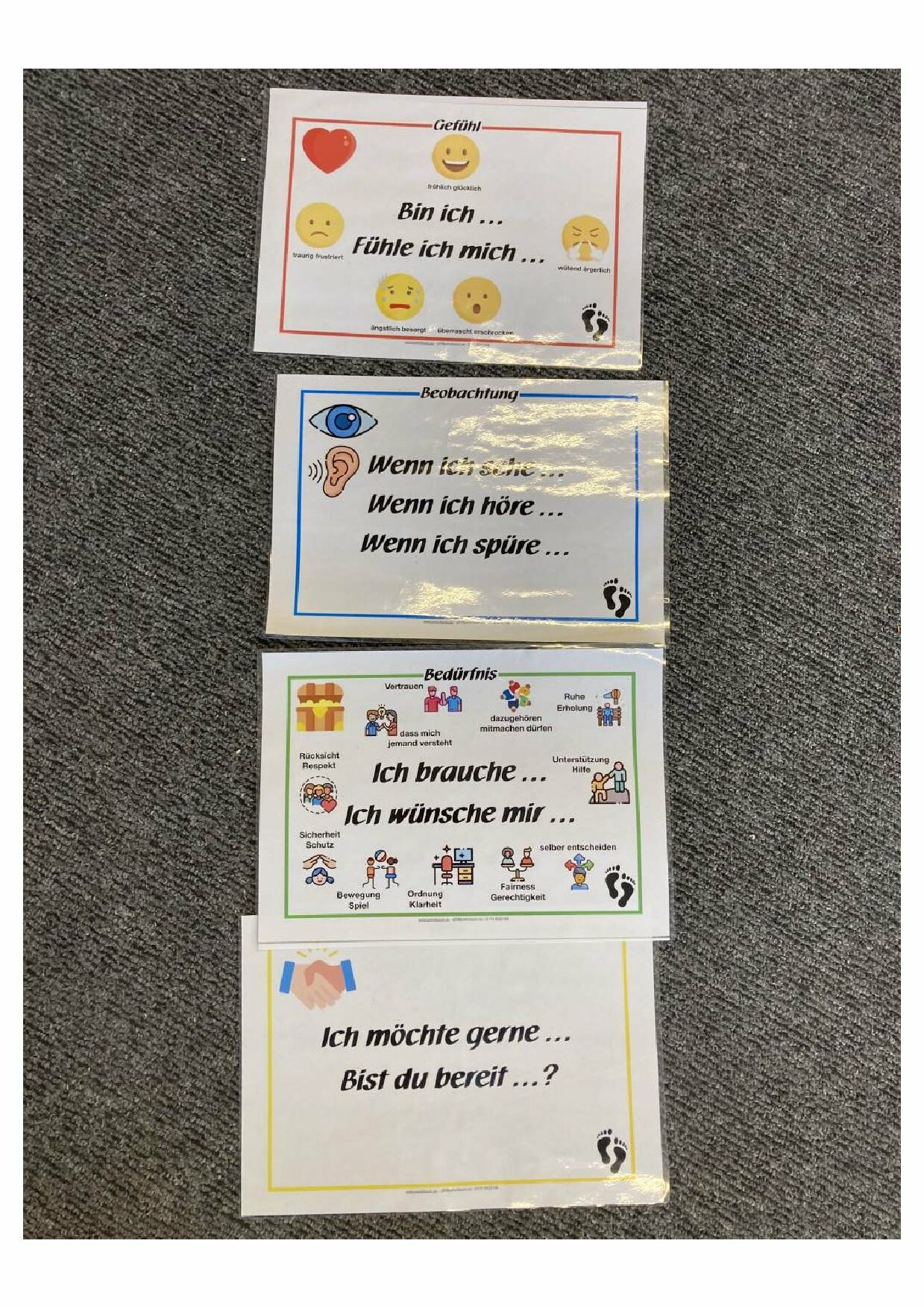 - Einführung in die vier Schritte der GFK: Beobachtung, Gefühl, Bedürfnis, Bitte